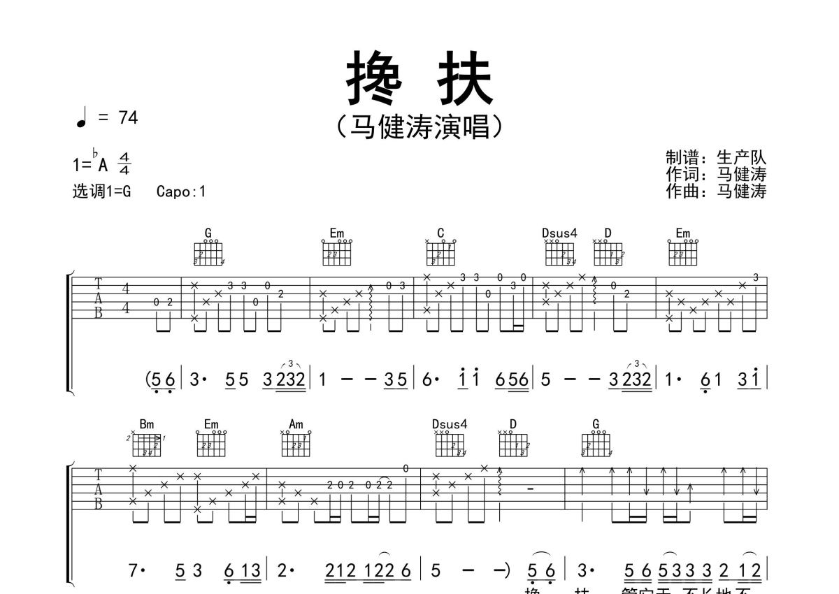 《搀扶》是马健涛演唱的一首歌曲,精编完美版,拍号为4/4拍,歌曲速度为每分钟74拍,歌曲原调为Ab调,但由于原调指法比较难,为了方便弹奏,本吉他谱采用的是G调指法编配,变调夹1品弹奏即为原调,当然也可以根据自己的音域改变变调夹位置,或者通过改变和弦调性,以方便自己弹奏,这份吉他谱共有三张高清图谱,图谱由 @生产队 编配上传,图谱使用六线谱编配,包含吉他和弦指法、简谱以及歌词部分,使用这份搀扶吉他谱,可以让你更加方便地掌握这首歌曲的弹唱技巧,快来尝试吧。马健涛作词、作曲并演唱的歌曲《搀扶》原版吉他谱,完整的前奏、间奏solo编配,精编完美版,值得推荐!。