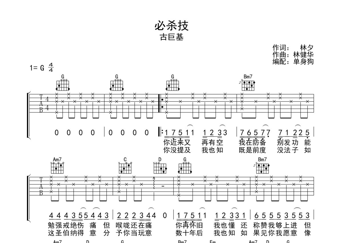 《必杀技》是古巨基演唱的一首歌曲,本吉他谱采用的是G调指法编配,这份吉他谱共有两张高清图谱,图谱由 @单身狗 编配上传,图谱使用六线谱编配,包含吉他和弦指法、简谱以及歌词部分,使用这份必杀技吉他谱,可以让你更加方便地掌握这首歌曲的弹唱技巧,快来尝试吧。古巨基《必杀技》吉他弹唱谱,采用G调指法编配,单身狗编配出品,共有2张高清图谱,免翻页排版设计。