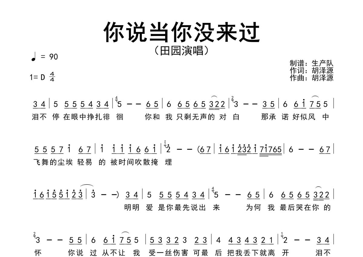 《你说当你没来过》是田园演唱的一首歌曲,原版简谱,拍号为4/4拍,歌曲速度为每分钟90拍,这份简谱共有两张高清图谱,图谱由 @生产队 编配上传田园演唱的歌曲《你说当你没来过》原版简谱,完整的前奏、间奏solo编配。