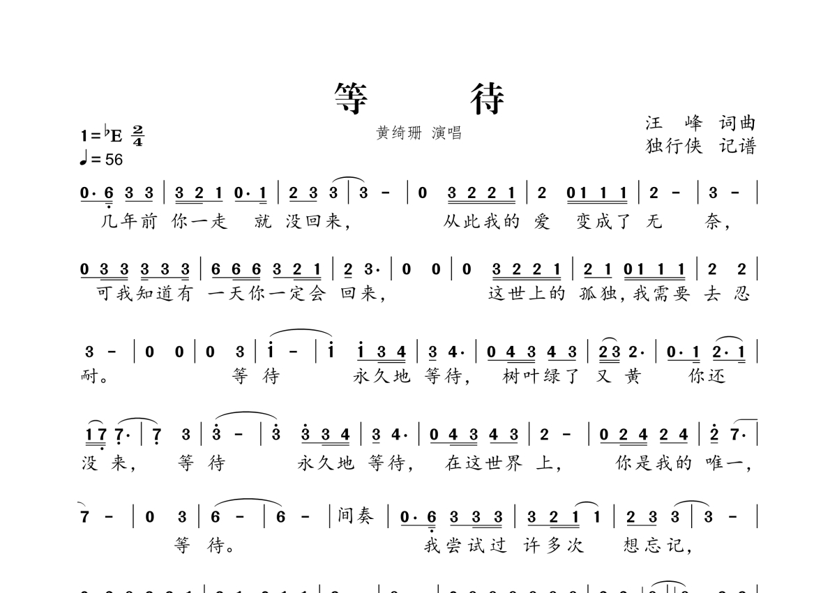 《等待》是黄绮珊演唱的一首歌曲,拍号为2/4拍,歌曲速度为每分钟55拍,这份简谱共有一张高清图谱,图谱由 @独行侠 编配上传。