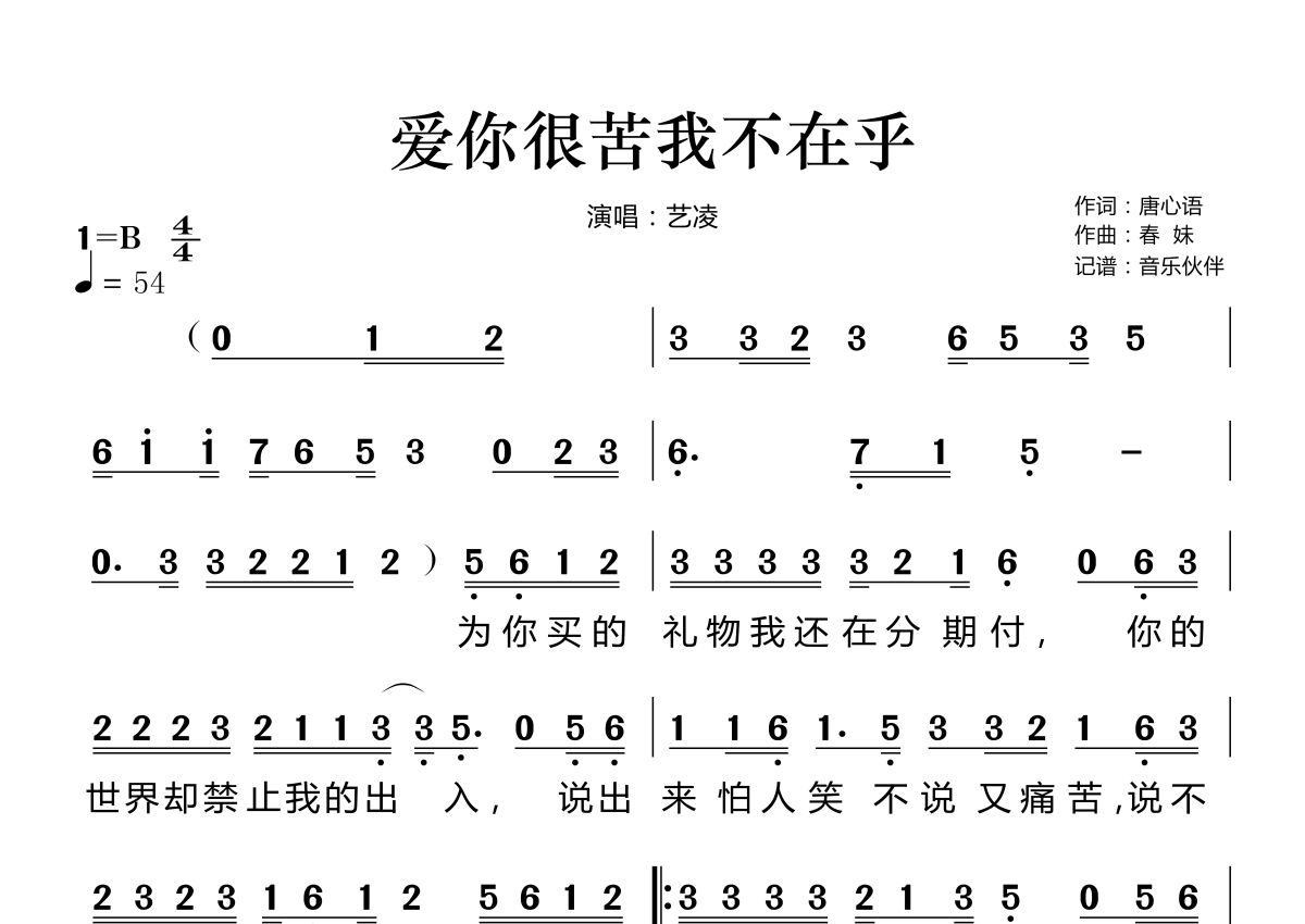 《爱你很苦我不在乎》是艺凌演唱的一首歌曲,这份简谱共有两张高清图谱,图谱由 @音乐伙伴 编配上传。