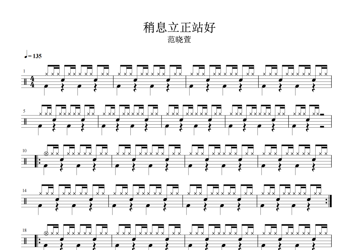《稍息立正站好》是范晓萱演唱的一首歌曲,拍号为4/4拍,这份架子鼓谱共有两张高清图谱,图谱由 @老虎不说谎 编配上传,图谱使用五线谱编配,使用这份稍息立正站好架子鼓谱,你将能够轻松地敲打出这首范晓萱的稍息立正站好,快来尝试吧。