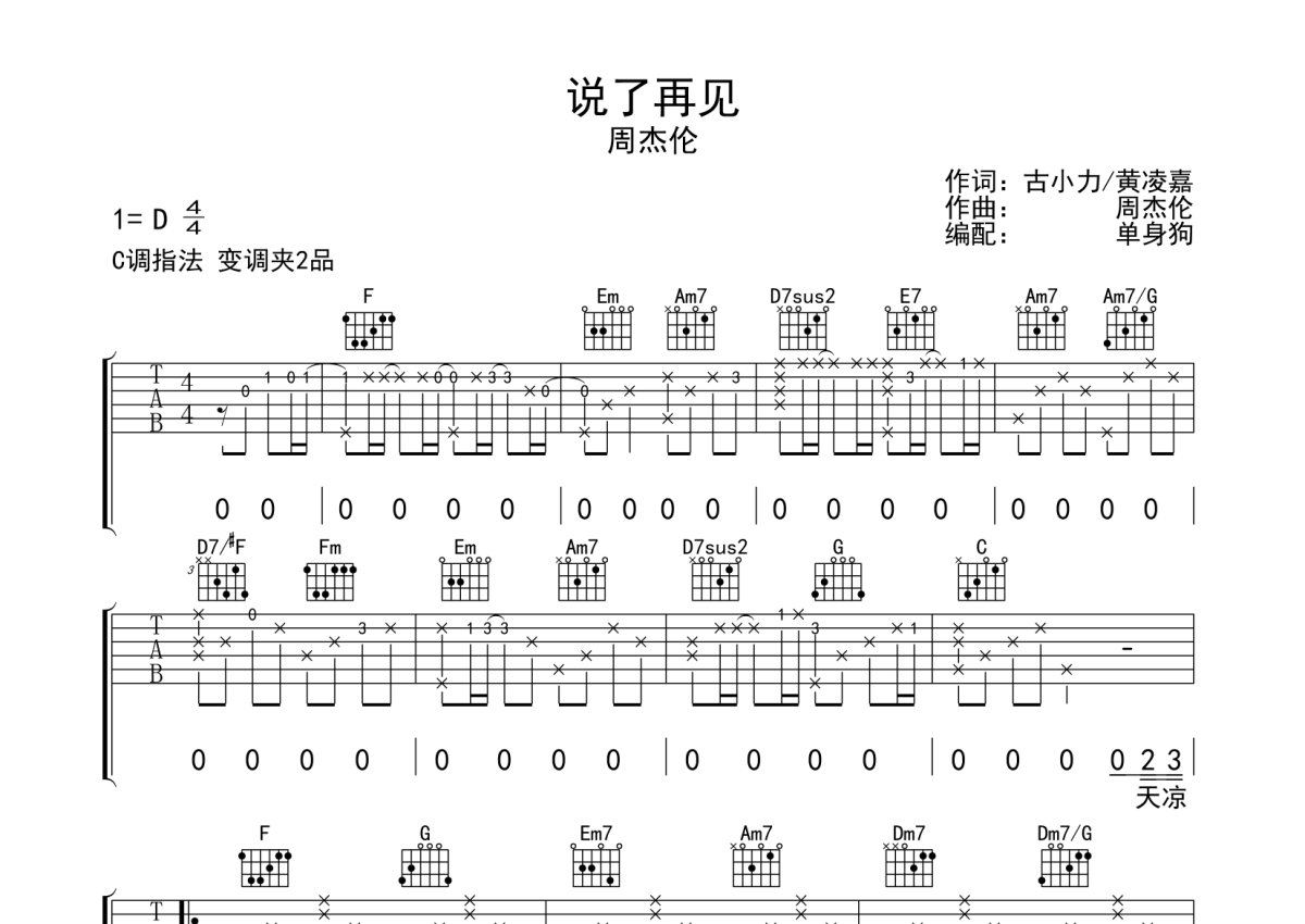 周杰伦《说了再见》吉他谱 - C调弹唱六线谱