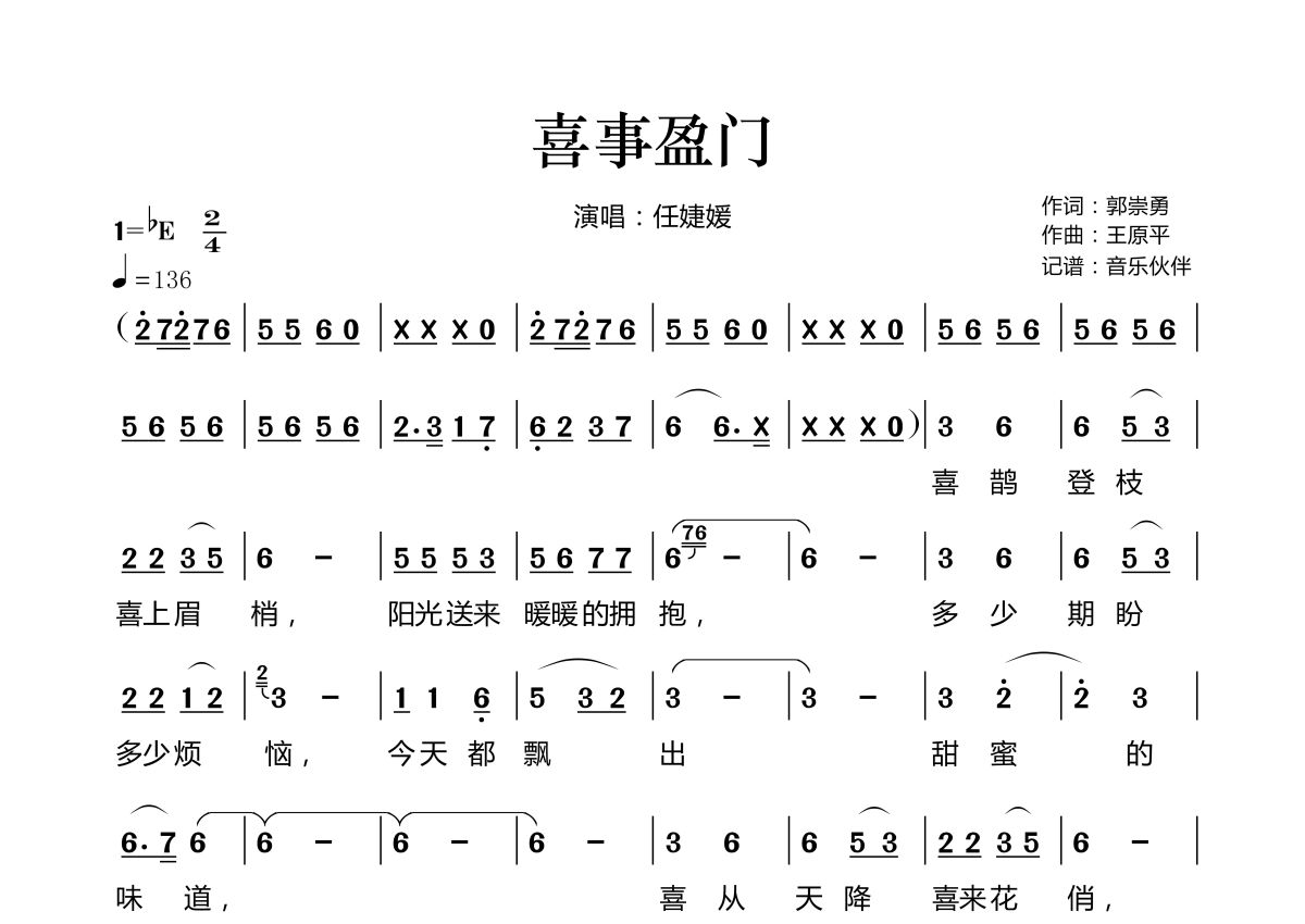 《喜事盈门》是任婕媛演唱的一首歌曲,拍号为2/4拍,歌曲速度为每分钟136拍,这份简谱共有两张高清图谱,图谱由 @音乐伙伴 编配上传。