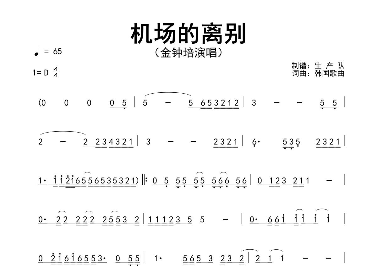 《机场的离别(韩国歌曲)》是韩国歌曲演唱的一首歌曲,原版简谱,拍号为4/4拍,歌曲速度为每分钟65拍,这份简谱共有一张高清图谱,图谱由 @生产队 编配上传金钟培演唱的韩国经典歌曲《机场的离别》原版简谱,精准的前奏、间奏solo编配。
