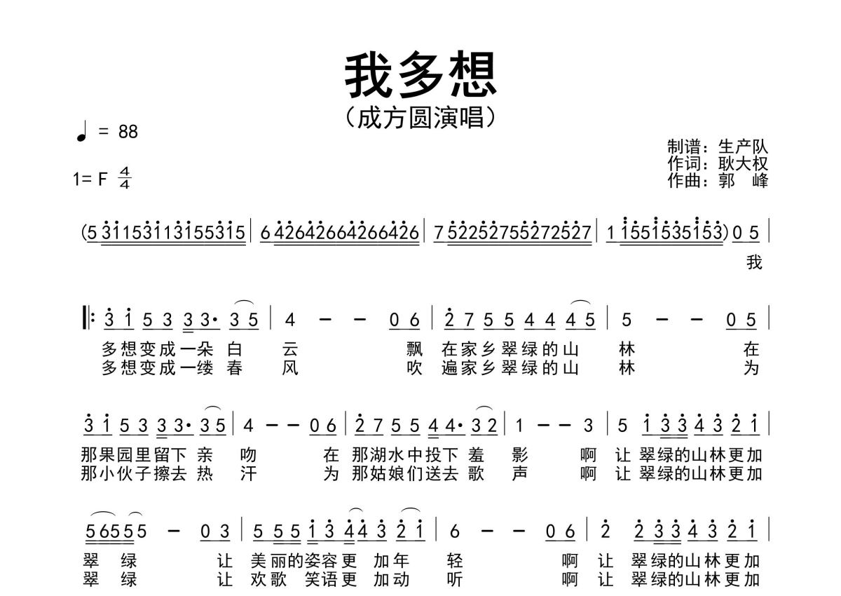 《我多想》是成方圆演唱的一首歌曲,原版简谱,拍号为4/4拍,歌曲速度为每分钟88拍,这份简谱共有一张高清图谱,图谱由 @生产队 编配上传成方圆演唱的歌曲《我多想》原版简谱,完整的前奏、间奏solo编配。