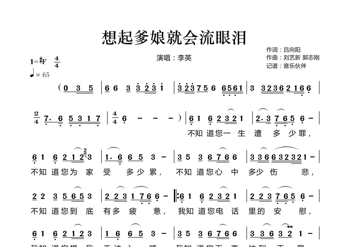 《想起爹娘就会流眼泪》是李英演唱的一首歌曲,拍号为4/4拍,歌曲速度为每分钟65拍,这份简谱共有两张高清图谱,图谱由 @音乐伙伴 编配上传。