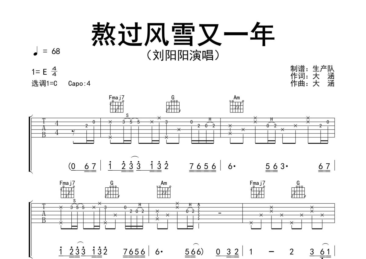 《熬过风雪又一年》是刘阳阳演唱的一首歌曲,精编完美版,拍号为4/4拍,歌曲速度为每分钟68拍,歌曲原调为E调,但由于原调指法比较难,为了方便弹奏,本吉他谱采用的是C调指法编配,变调夹4品弹奏即为原调,当然也可以根据自己的音域改变变调夹位置,或者通过改变和弦调性,以方便自己弹奏,这份吉他谱共有三张高清图谱,图谱由 @生产队 编配上传,图谱使用六线谱编配,包含吉他和弦指法、简谱以及歌词部分,使用这份熬过风雪又一年吉他谱,可以让你更加方便地掌握这首歌曲的弹唱技巧,快来尝试吧。刘阳阳演唱的歌曲《熬过风雪又一年》原版吉他谱,精准的前奏、间奏、尾奏solo编配,精编完美版,值得推荐!。