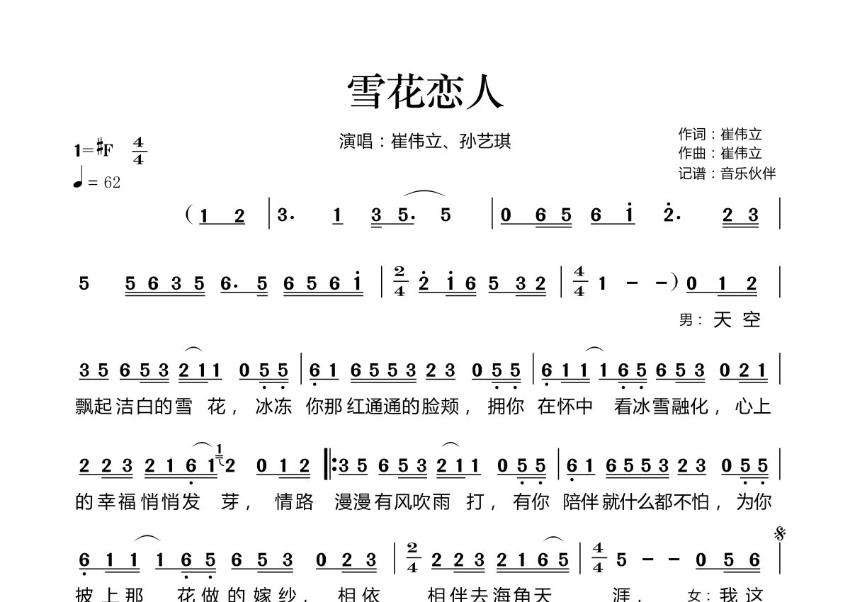 雪花恋人简谱 - 崔伟立、孙艺琪演唱