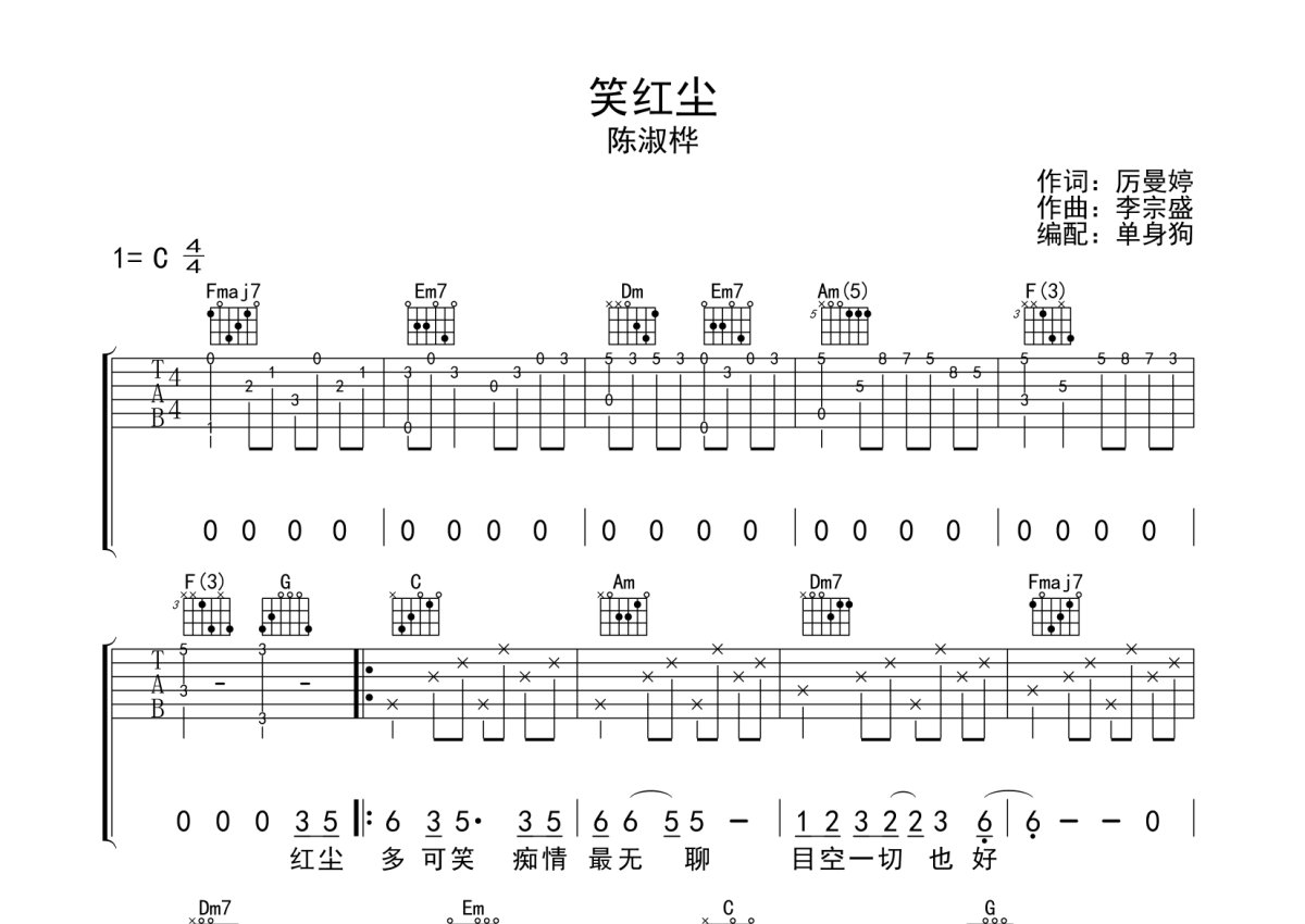 《笑红尘》是陈淑桦演唱的一首歌曲,本吉他谱采用的是C调指法编配,这份吉他谱共有三张高清图谱,图谱由 @单身狗 编配上传,图谱使用六线谱编配,包含吉他和弦指法、简谱以及歌词部分,使用这份笑红尘吉他谱,可以让你更加方便地掌握这首歌曲的弹唱技巧,快来尝试吧。陈淑桦《笑红尘》吉他弹唱谱,采用C调指法编配,单身狗编配出品,共有3张高清图谱。