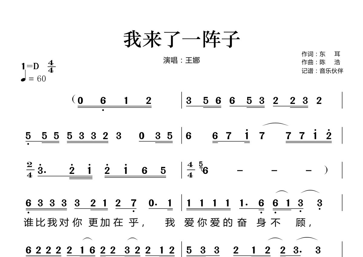 《我来了一阵子》是王娜演唱的一首歌曲,这份简谱共有两张高清图谱,图谱由 @音乐伙伴 编配上传。