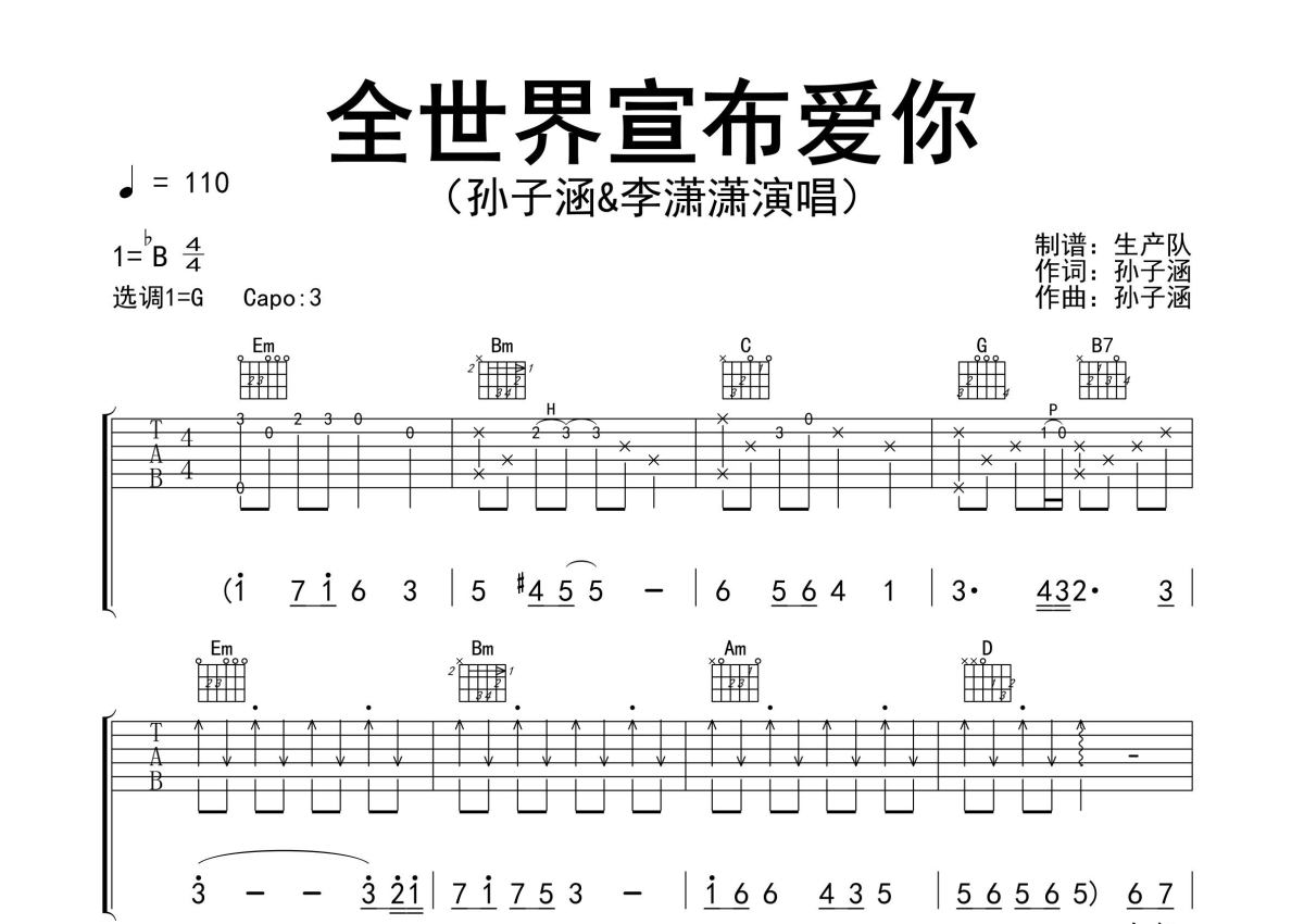 《全世界宣布爱你》是孙子涵&李潇潇演唱的一首歌曲,精编完美版,拍号为4/4拍,歌曲速度为每分钟110拍,歌曲原调为Bb调,但由于原调指法比较难,为了方便弹奏,本吉他谱采用的是G调指法编配,变调夹3品弹奏即为原调,当然也可以根据自己的音域改变变调夹位置,或者通过改变和弦调性,以方便自己弹奏,这份吉他谱共有三张高清图谱,图谱由 @生产队 编配上传,图谱使用六线谱编配,包含吉他和弦指法、简谱以及歌词部分,使用这份全世界宣布爱你吉他谱,可以让你更加方便地掌握这首歌曲的弹唱技巧,快来尝试吧。孙子涵&李潇潇演唱的歌曲《全世界宣布爱你》原版吉他谱,完整的前奏、间奏solo编配,精编完美版,怀旧经典!。