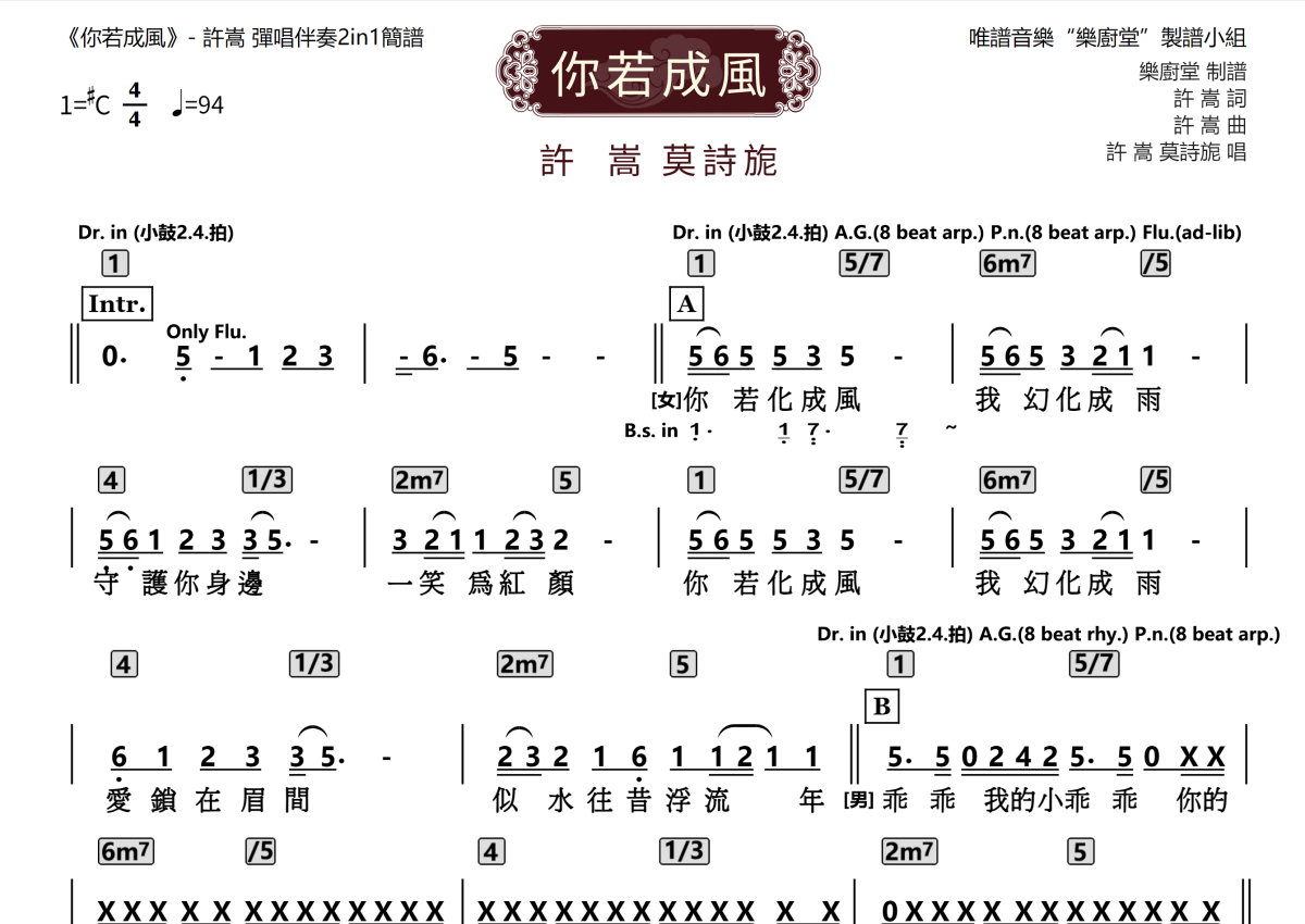 《你若成风》是许嵩 莫诗旎演唱的一首歌曲,拍号为4/4拍,这份乐队总谱共有两张高清图谱,图谱由 @唯谱音乐"乐厨堂"发布小组 编配上传。