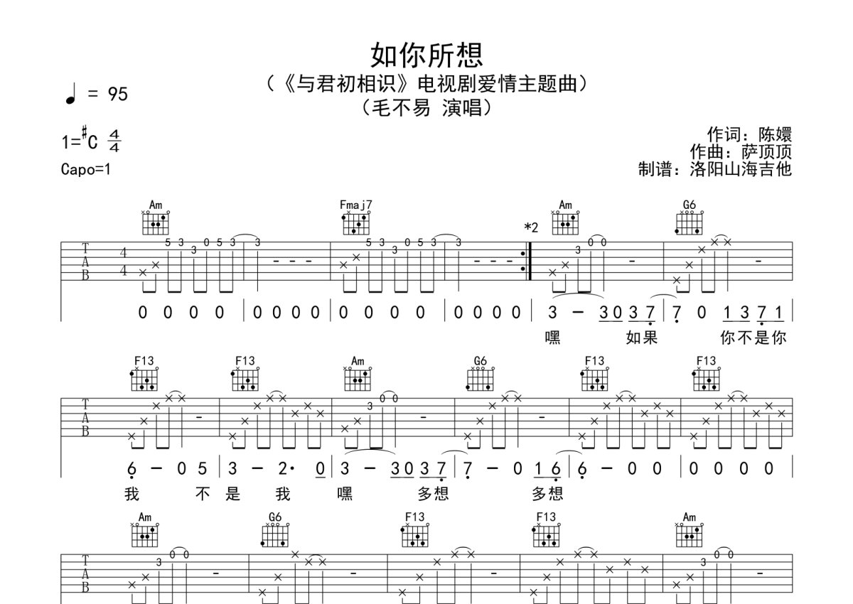 《如你所想》是毛不易演唱的一首歌曲,本吉他谱采用的是C调指法编配,这份吉他谱共有两张高清图谱,图谱由 @何奔洋 编配上传,图谱使用六线谱编配,包含吉他和弦指法、简谱以及歌词部分,曲谱配备了相关的音频提供试听,使用这份如你所想吉他谱,可以让你更加方便地掌握这首歌曲的弹唱技巧,快来尝试吧。