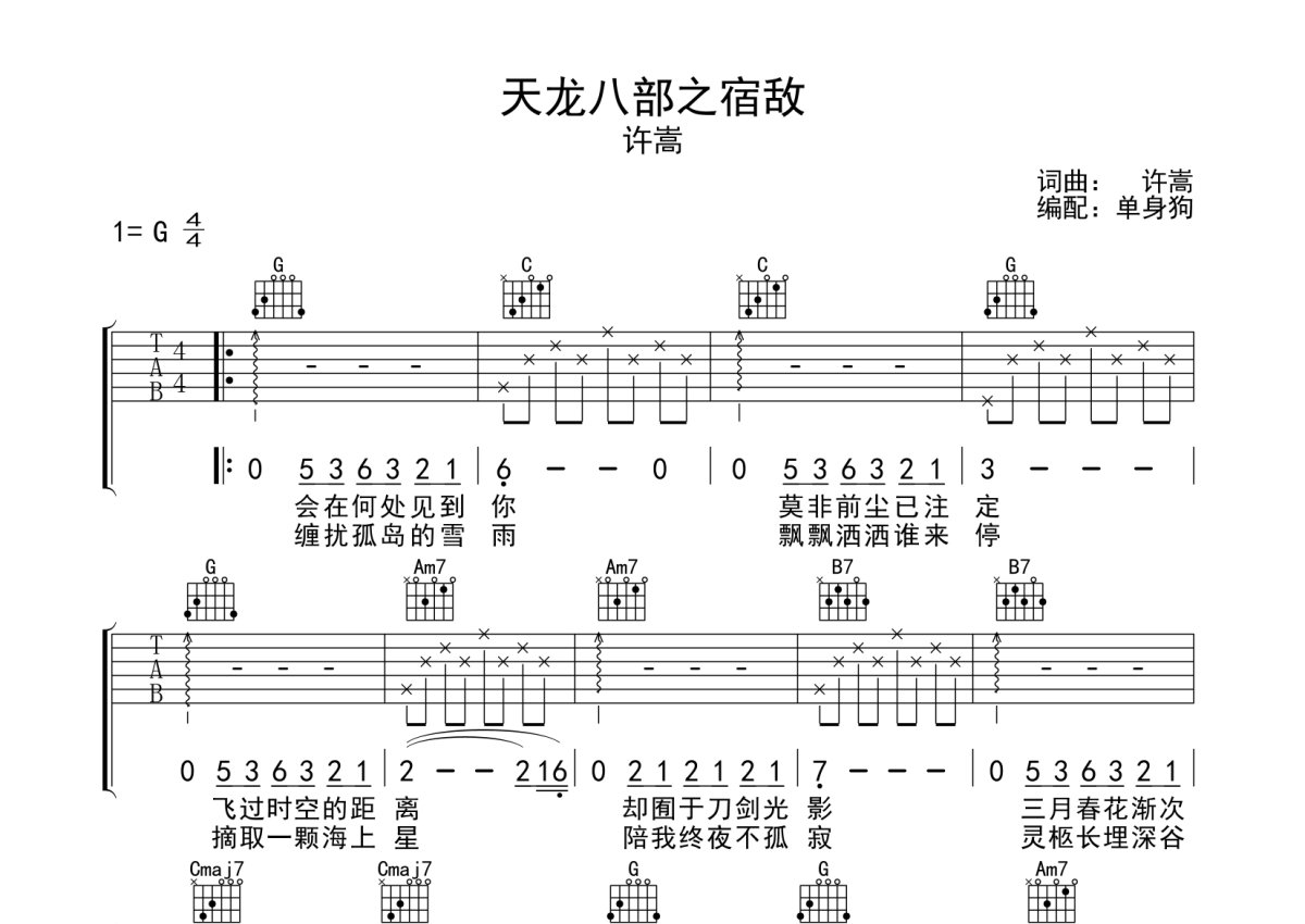 许嵩《天龙八部之宿敌》吉他谱 - G调弹唱六线谱