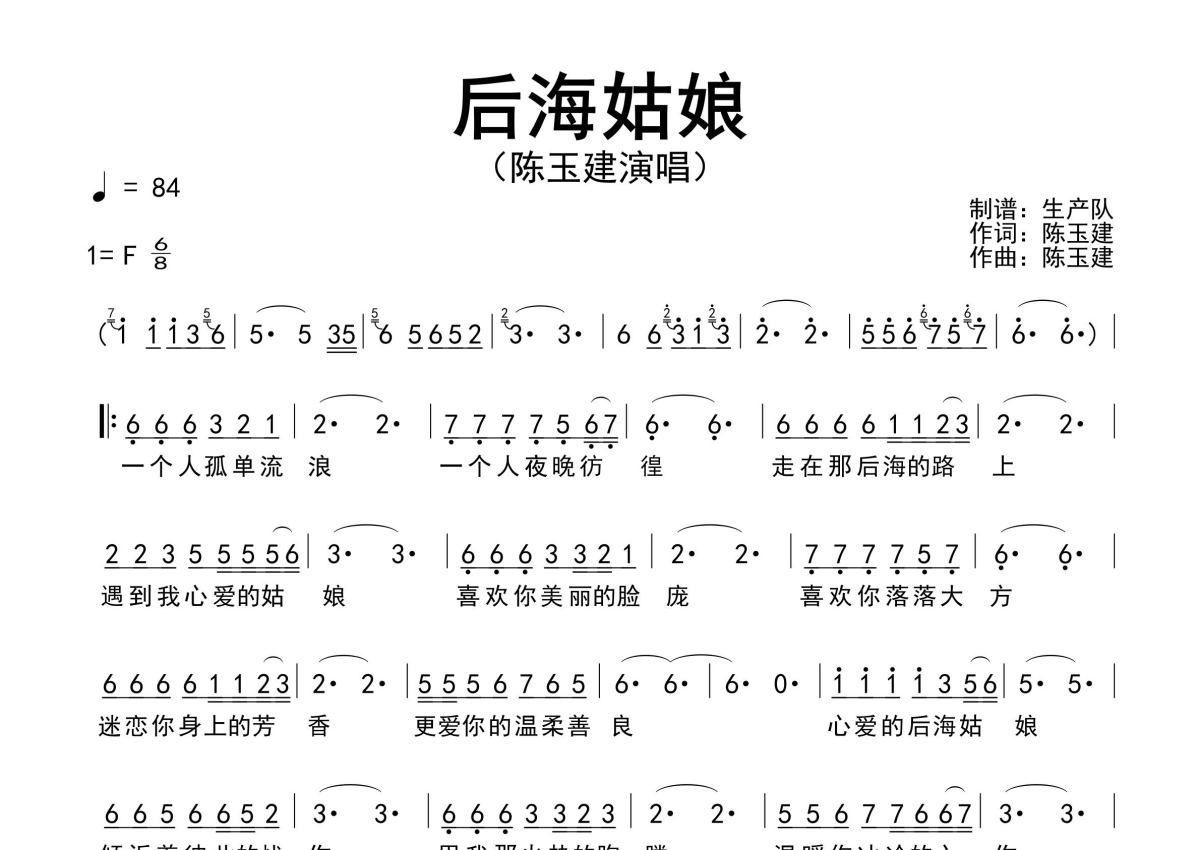 《后海姑娘》是陈玉建演唱的一首歌曲,原版简谱,拍号为6/8拍,歌曲速度为每分钟84拍,这份简谱共有一张高清图谱,图谱由 @生产队 编配上传陈玉建作词、作曲并演唱的歌曲《后海姑娘》原版简谱,完整的前奏、间奏、尾奏solo编配。