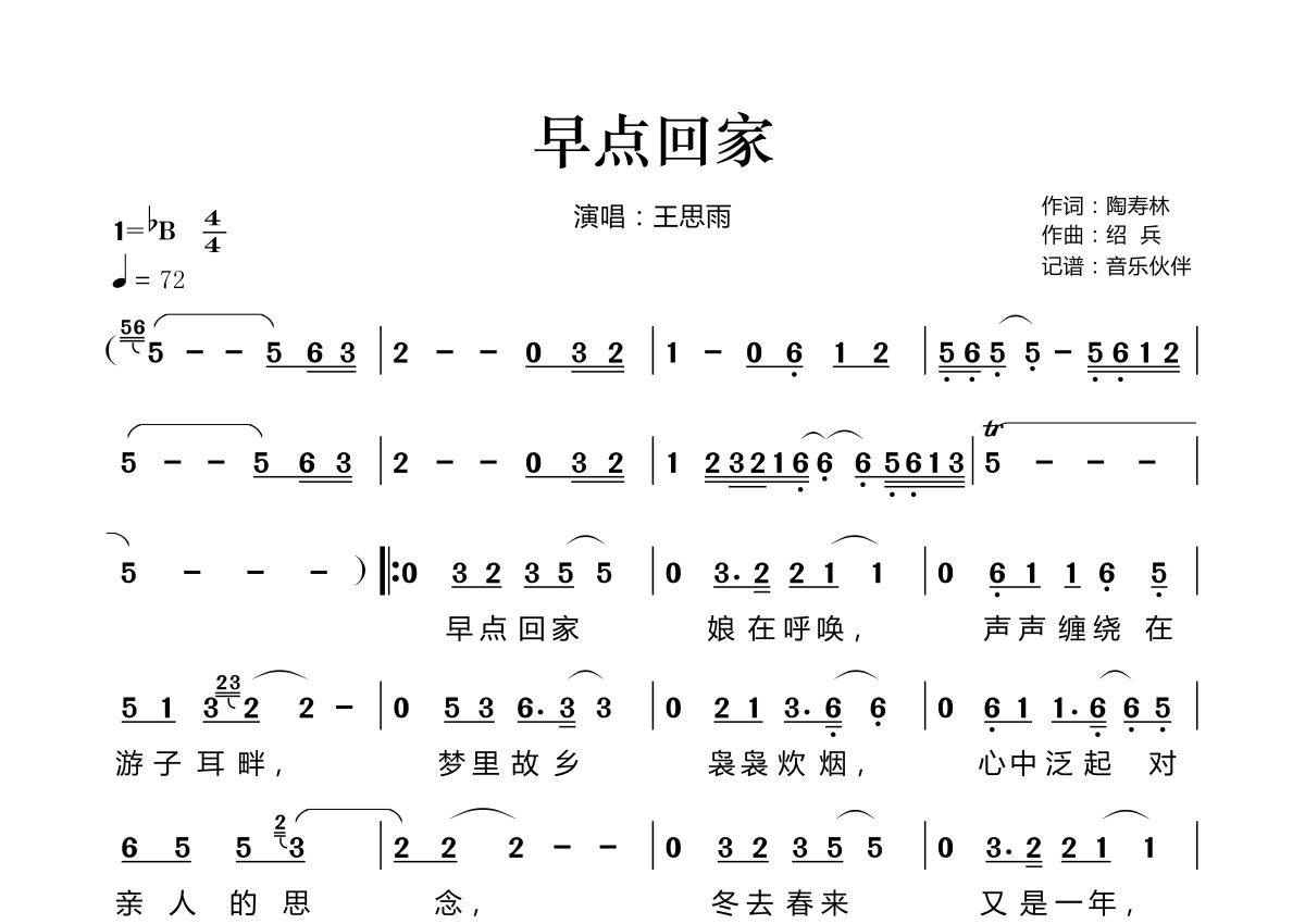 《早点回家》是王思雨演唱的一首歌曲,拍号为4/4拍,歌曲速度为每分钟72拍,这份简谱共有两张高清图谱,图谱由 @音乐伙伴 编配上传。