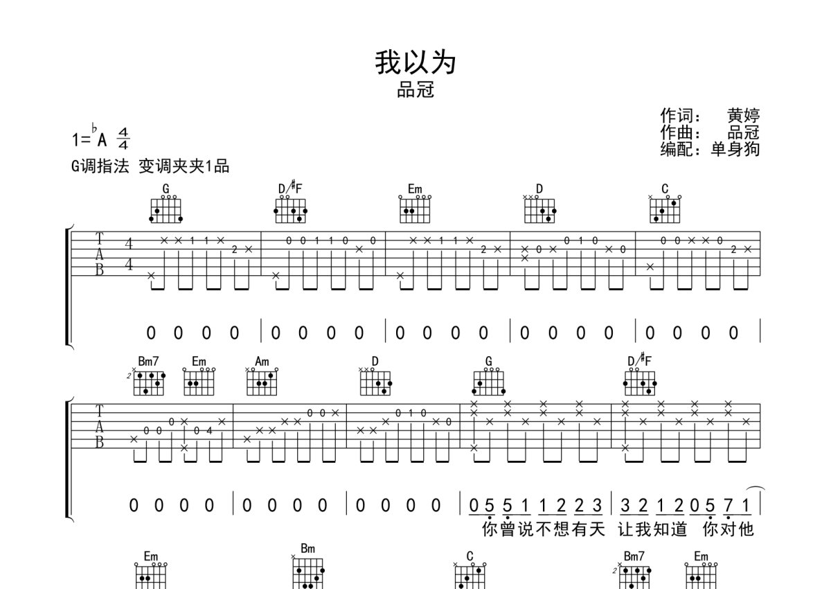 品冠《我以为》吉他谱 - G调弹唱六线谱