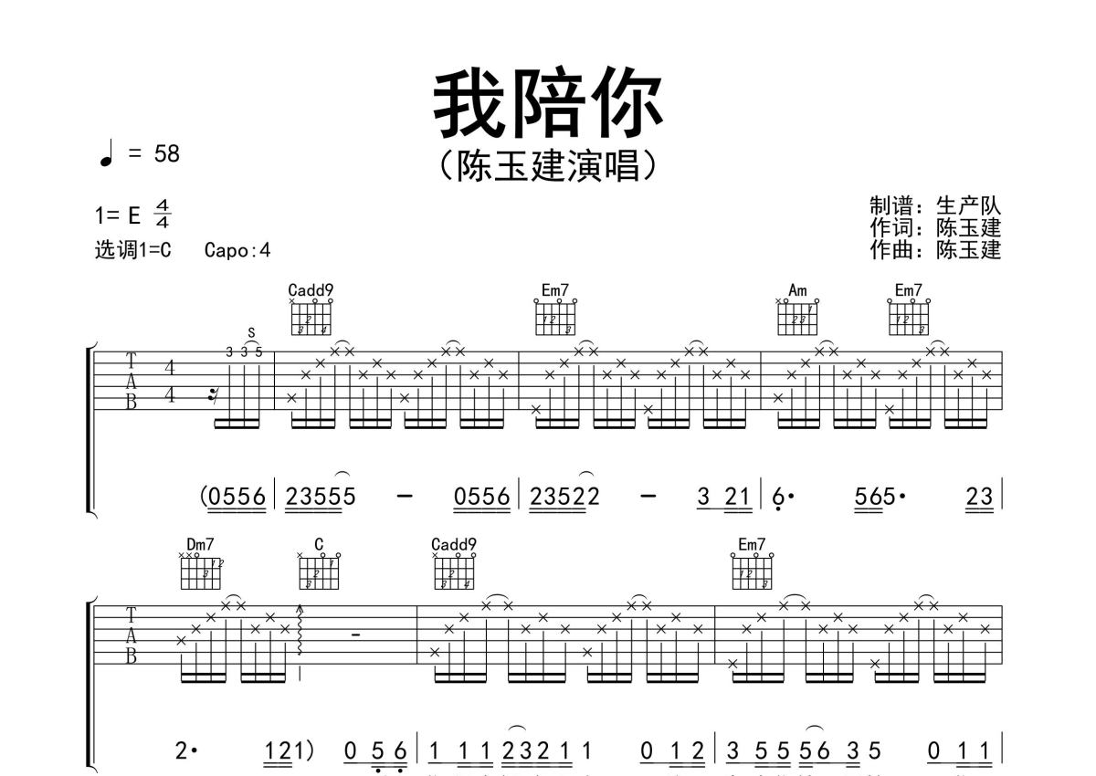 《我陪你》是陈玉建演唱的一首歌曲,精编完美版,拍号为4/4拍,歌曲速度为每分钟58拍,歌曲原调为E调,但由于原调指法比较难,为了方便弹奏,本吉他谱采用的是C调指法编配,变调夹4品弹奏即为原调,当然也可以根据自己的音域改变变调夹位置,或者通过改变和弦调性,以方便自己弹奏,这份吉他谱共有三张高清图谱,图谱由 @生产队 编配上传,图谱使用六线谱编配,包含吉他和弦指法、简谱以及歌词部分,使用这份我陪你吉他谱,可以让你更加方便地掌握这首歌曲的弹唱技巧,快来尝试吧。陈玉建作词、作曲并演唱的歌曲《我陪你》原版吉他谱,完整的前奏、间奏solo编配,精编完美版,值得推荐!。