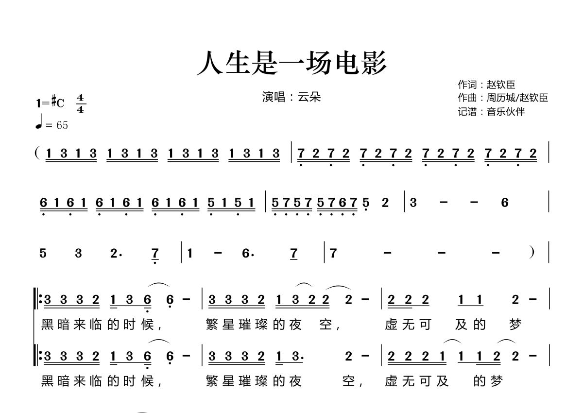 人生是一场电影简谱 - 云朵演唱