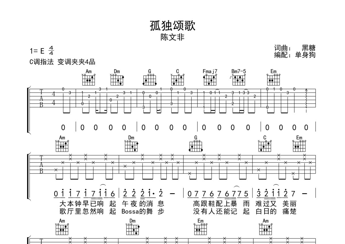 陈文非《孤独颂歌》吉他谱 - C调弹唱六线谱