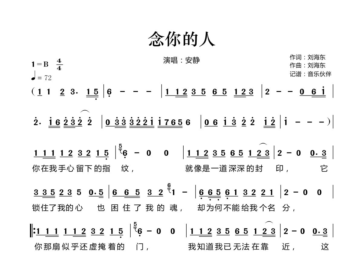 《念你的人》是安静演唱的一首歌曲,拍号为4/4拍,歌曲速度为每分钟72拍,这份简谱共有两张高清图谱,图谱由 @音乐伙伴 编配上传。
