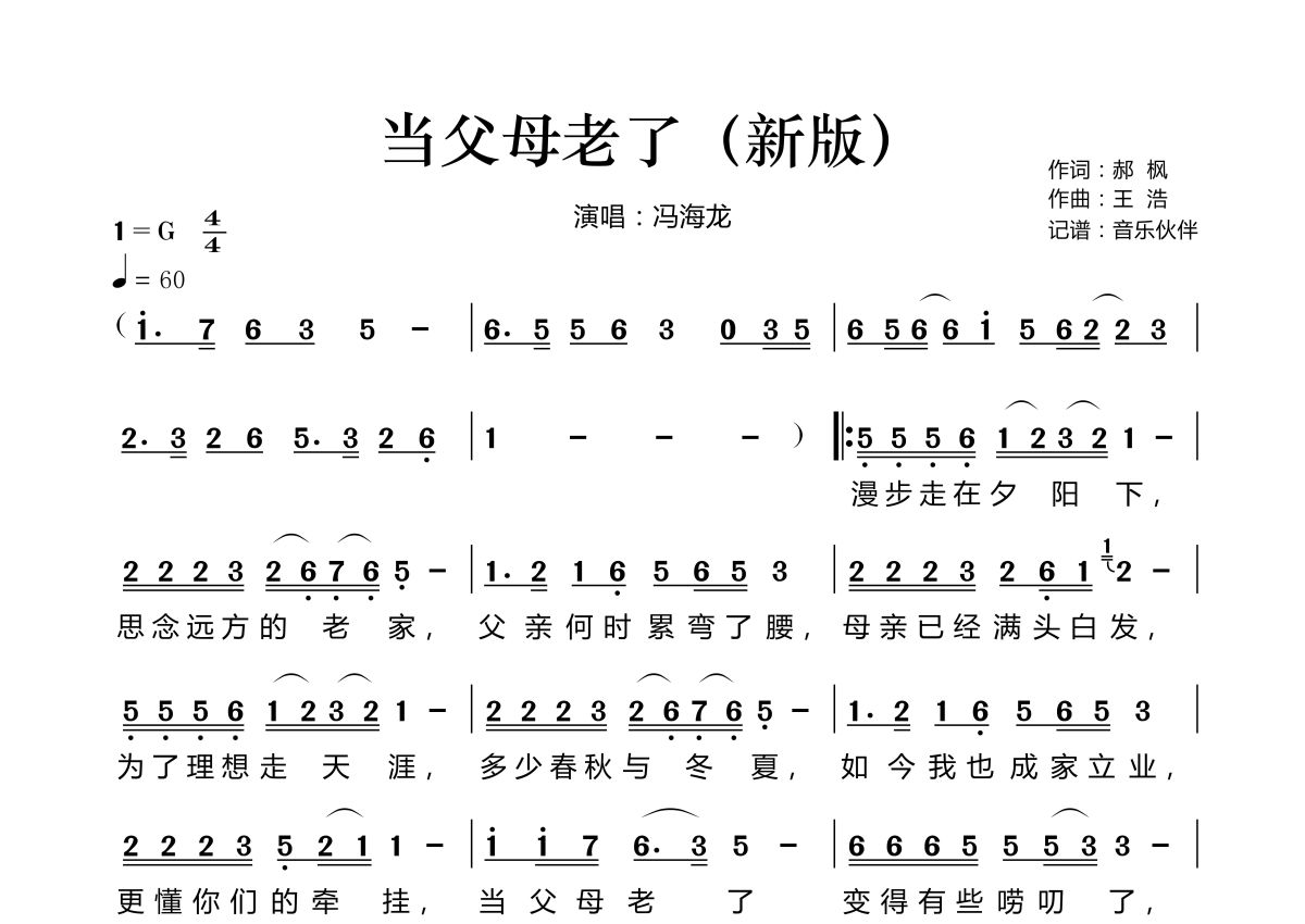 《当父母老了(新版)》是新版演唱的一首歌曲,这份简谱共有一张高清图谱,图谱由 @音乐伙伴 编配上传。