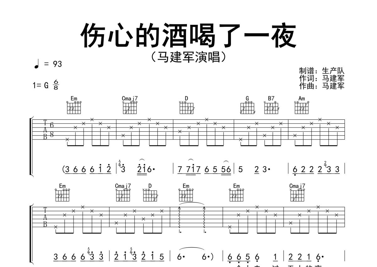 《伤心的酒喝了一夜》是马建军演唱的一首歌曲,精编完美版,拍号为6/8拍,歌曲速度为每分钟93拍,歌曲原调为G调,本吉他谱采用的是G调指法编配,演奏时不需要使用变调夹即为原调,这份吉他谱共有三张高清图谱,图谱由 @生产队 编配上传,图谱使用六线谱编配,包含吉他和弦指法、简谱以及歌词部分,使用这份伤心的酒喝了一夜吉他谱,可以让你更加方便地掌握这首歌曲的弹唱技巧,快来尝试吧。马建军作词、作曲并演唱的歌曲《伤心的酒喝了一夜》原版吉他谱,完整的前奏、间奏、尾奏solo编配,精编完美版,值得推荐!。