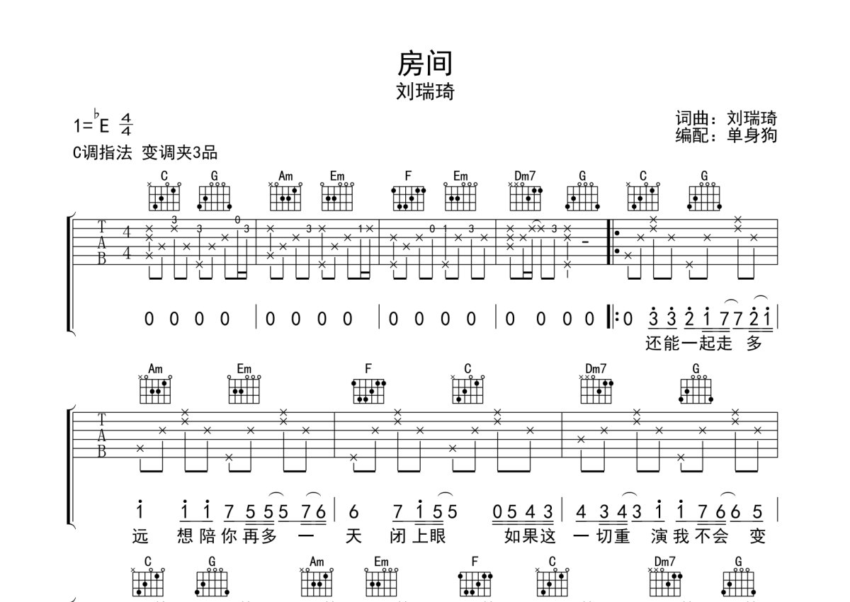 《房间》是刘瑞琦演唱的一首歌曲,本吉他谱采用的是C调指法编配,这份吉他谱共有两张高清图谱,图谱由 @单身狗 编配上传,图谱使用六线谱编配,包含吉他和弦指法、简谱以及歌词部分,使用这份房间吉他谱,可以让你更加方便地掌握这首歌曲的弹唱技巧,快来尝试吧。刘瑞琦《房间》吉他弹唱谱,采用C调指法编配,单身狗编配出品,共有2张高清图谱,免翻页排版设计。