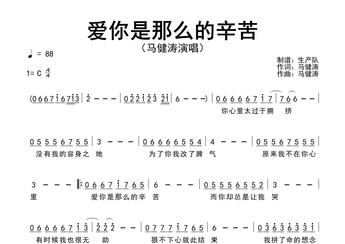 《爱你是那么的辛苦》是马健涛演唱的一首歌曲,原版简谱,拍号为4/4拍,歌曲速度为每分钟88拍,这份简谱共有一张高清图谱,图谱由 @生产队 编配上传马健涛作词、作曲并演唱的歌曲《爱你是那么的辛苦》原版简谱,完整的前奏、间奏、尾奏solo编配。