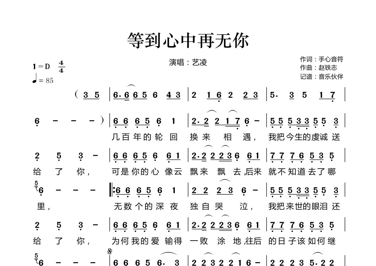 等到心中再无你简谱 - 艺凌演唱