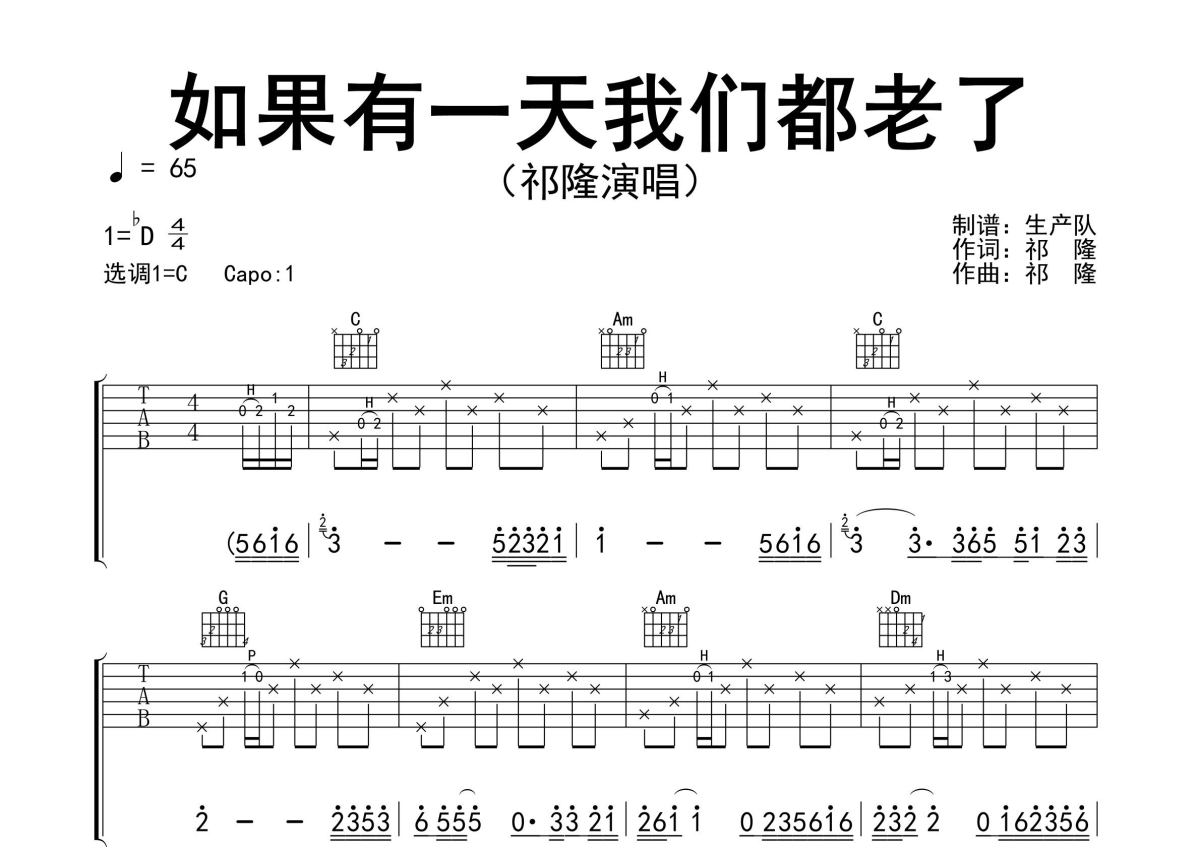 《如果有一天我们都老了》是祁隆演唱的一首歌曲,精编完美版,拍号为4/4拍,歌曲速度为每分钟65拍,歌曲原调为Db调,但由于原调指法比较难,为了方便弹奏,本吉他谱采用的是C调指法编配,变调夹1品弹奏即为原调,当然也可以根据自己的音域改变变调夹位置,或者通过改变和弦调性,以方便自己弹奏,这份吉他谱共有三张高清图谱,图谱由 @生产队 编配上传,图谱使用六线谱编配,包含吉他和弦指法、简谱以及歌词部分,使用这份如果有一天我们都老了吉他谱,可以让你更加方便地掌握这首歌曲的弹唱技巧,快来尝试吧。祁隆作词、作曲并演唱的歌曲《如果有一天我们都老了》原版吉他谱,完整的前奏、间奏solo编配,精编完美版,怀旧经典!。