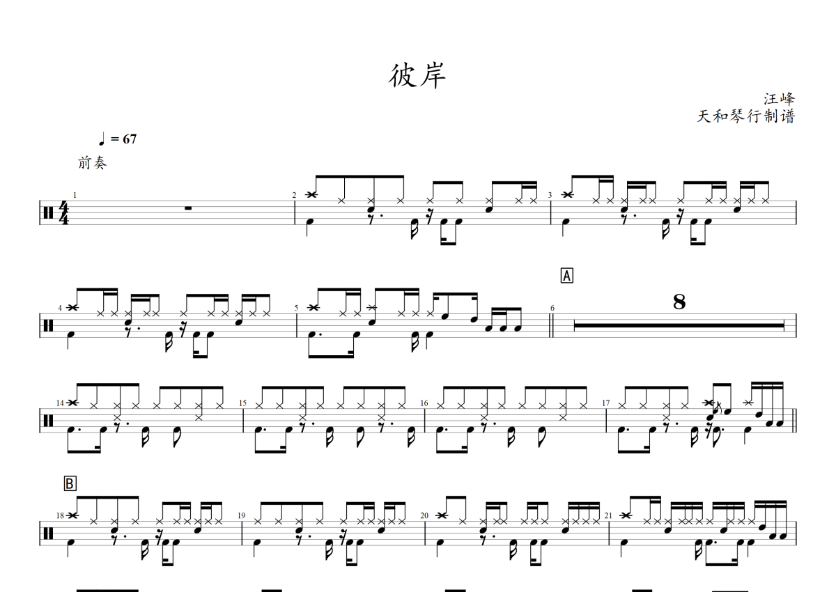 《彼岸》是汪峰演唱的一首歌曲,拍号为4/4拍,歌曲速度为每分钟67拍,这份架子鼓谱共有两张高清图谱,图谱由 @音符喷血者 编配上传,图谱使用五线谱编配,使用这份彼岸架子鼓谱,你将能够轻松地敲打出这首汪峰的彼岸,快来尝试吧。