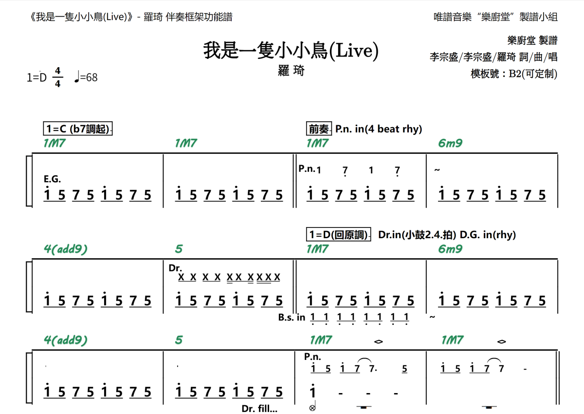 “乐厨堂”乐谱发布小组: 出版级乐谱扒谱制谱——以职业乐手圈通行标准记谱,遵循原版和声、伴奏元素和段落结构。 ❶ 2.0多功能专业团谱:采用台湾卓著公司开创的二代简谱标准制作。二代简谱无疑是迄今为止最科学、最易读的专业范畴多功能记谱方案:❷ 框架谱:采用职业乐手通常记谱方案制作。