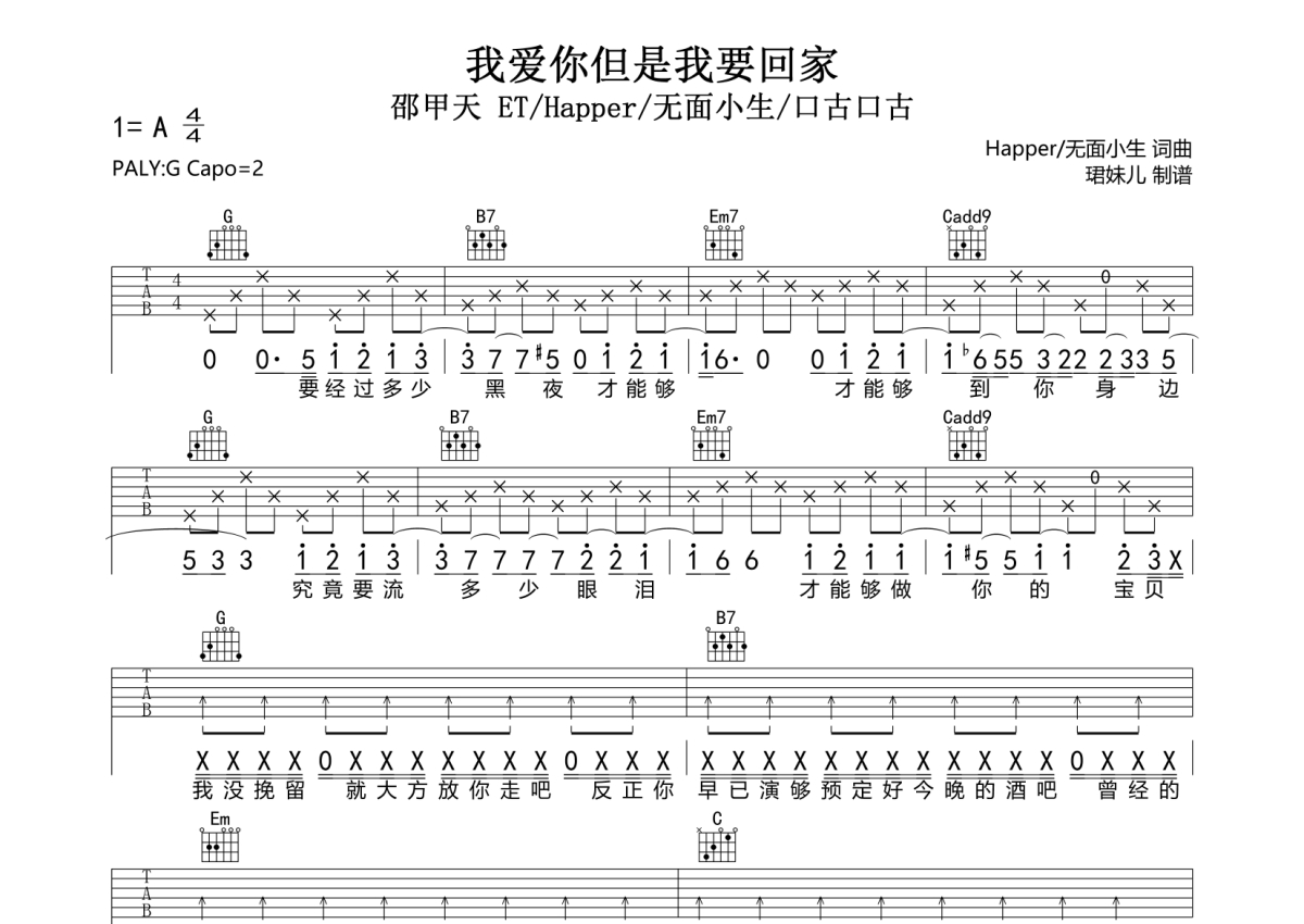 邵甲天 ET/Happer/无面小生/口古口古《我爱你但是我要回家》吉他谱 - G调弹唱六线谱