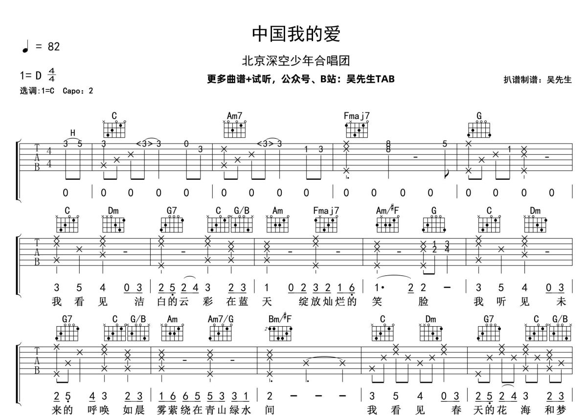 《中国我的爱》是北京深空少年合唱团演唱的一首歌曲,拍号为4/4拍,歌曲速度为每分钟82拍,歌曲原调为D调,但由于原调指法比较难,为了方便弹奏,本吉他谱采用的是C调指法编配,变调夹2品弹奏即为原调,当然也可以根据自己的音域改变变调夹位置,或者通过改变和弦调性,以方便自己弹奏,这份吉他谱共有三张高清图谱,图谱由 @吴先生TAB 编配上传,图谱使用六线谱编配,包含吉他和弦指法、简谱以及歌词部分,曲谱配备了相关的音频提供试听,使用这份中国我的爱吉他谱,可以让你更加方便地掌握这首歌曲的弹唱技巧,快来尝试吧。