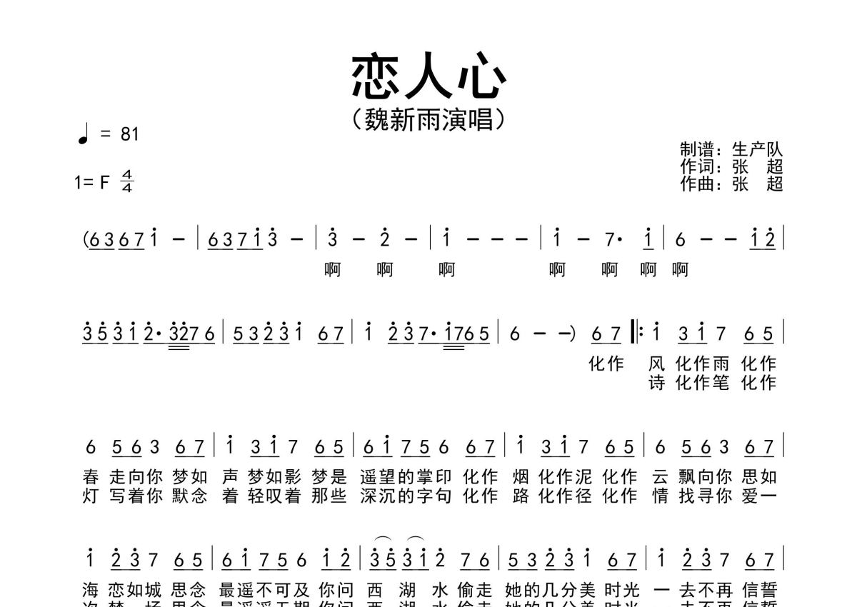 《恋人心》是魏新雨演唱的一首歌曲,原版简谱,拍号为4/4拍,歌曲速度为每分钟81拍,这份简谱共有一张高清图谱,图谱由 @生产队 编配上传魏新雨演唱的歌曲《恋人心》原版简谱,完整的前奏、间奏、尾奏solo编配。