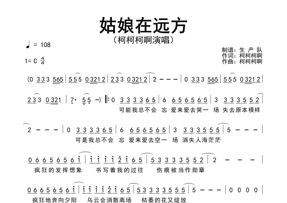 《姑娘在远方》是柯柯柯啊演唱的一首歌曲,原版简谱,拍号为4/4拍,歌曲速度为每分钟108拍,这份简谱共有一张高清图谱,图谱由 @生产队 编配上传柯柯柯啊演唱的歌曲《姑娘在远方》原版简谱,完整的前奏、间奏、尾奏solo编配。