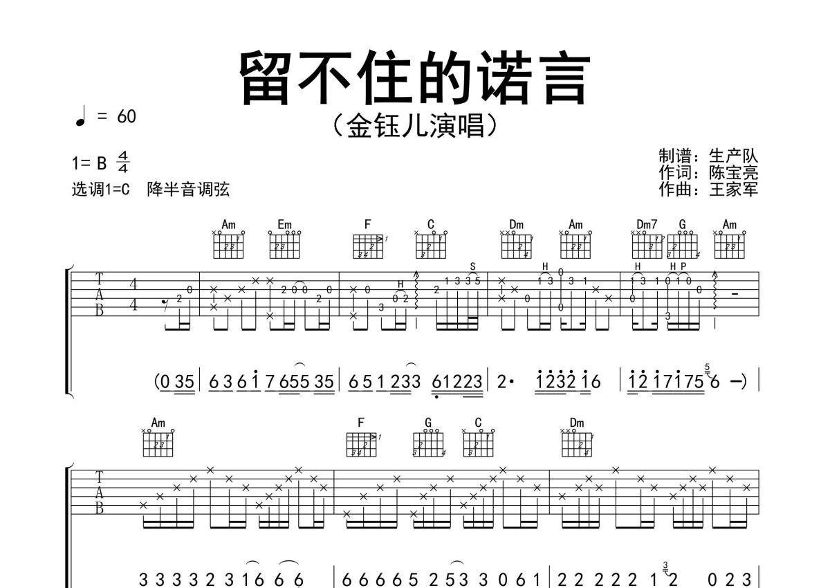 《留不住的诺言》是金钰儿演唱的一首歌曲,精编完美版,拍号为4/4拍,歌曲速度为每分钟60拍,歌曲原调为B调,但由于原调指法比较难,为了方便弹奏,本吉他谱采用的是C调指法编配,降半音调弦弹奏即为原调,当然也可以根据自己的音域决定是否调弦,这份吉他谱共有两张高清图谱,图谱由 @生产队 编配上传,图谱使用六线谱编配,包含吉他和弦指法、简谱以及歌词部分,使用这份留不住的诺言吉他谱,可以让你更加方便地掌握这首歌曲的弹唱技巧,快来尝试吧。金钰儿演唱的歌曲《留不住的诺言》原版吉他谱,完整的前奏、间奏solo编配,精编完美版,值得推荐!。