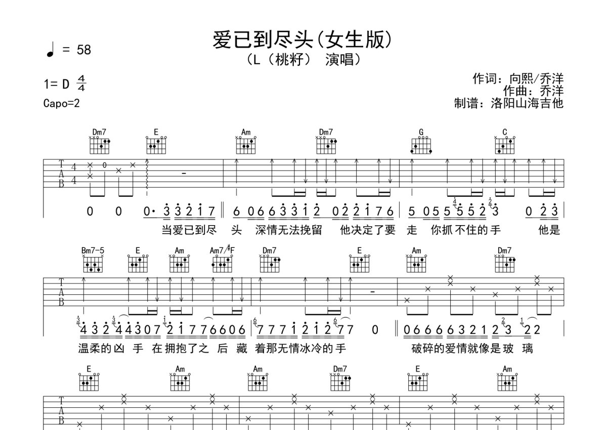 《爱已到尽头》是L(桃籽)演唱的一首歌曲,本吉他谱采用的是C调指法编配,这份吉他谱共有两张高清图谱,图谱由 @何奔洋 编配上传,图谱使用六线谱编配,包含吉他和弦指法、简谱以及歌词部分,曲谱配备了相关的音频提供试听,使用这份爱已到尽头吉他谱,可以让你更加方便地掌握这首歌曲的弹唱技巧,快来尝试吧。