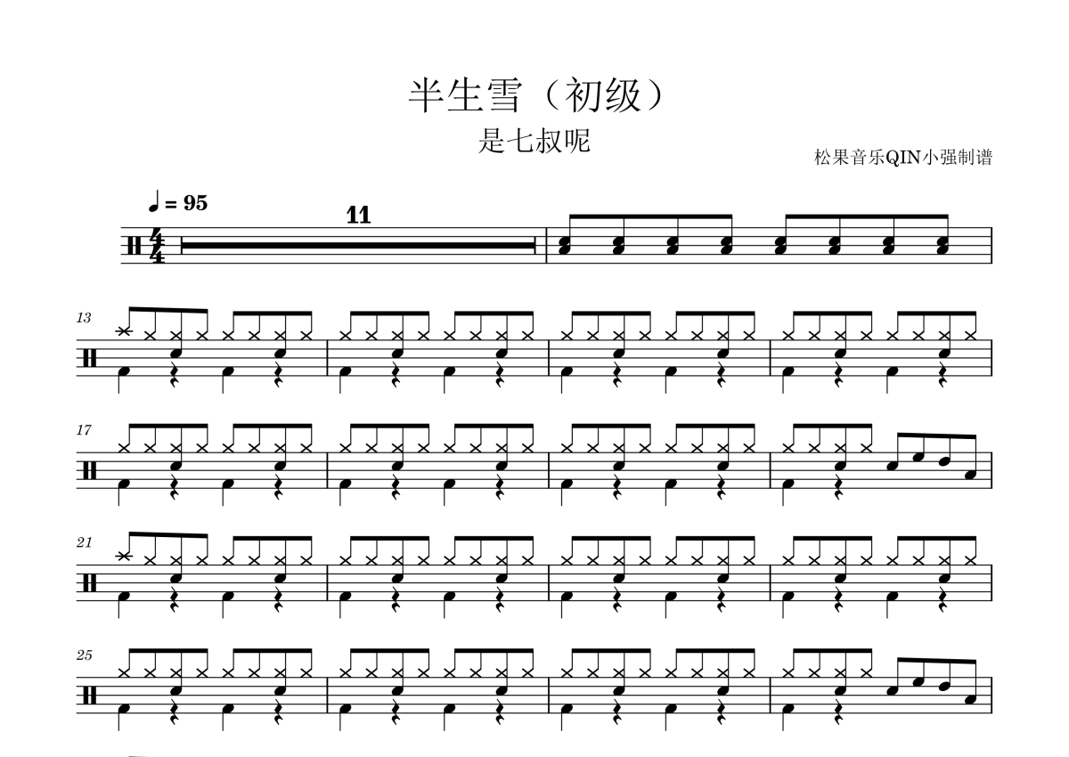 《半生雪(初级)》是初级演唱的一首歌曲,拍号为4/4拍,这份架子鼓谱共有两张高清图谱,图谱由 @松果音乐QIN小强 编配上传,图谱使用五线谱编配,使用这份半生雪(初级)架子鼓谱,你将能够轻松地敲打出这首初级的半生雪(初级),快来尝试吧。初级编配 适合初学者。