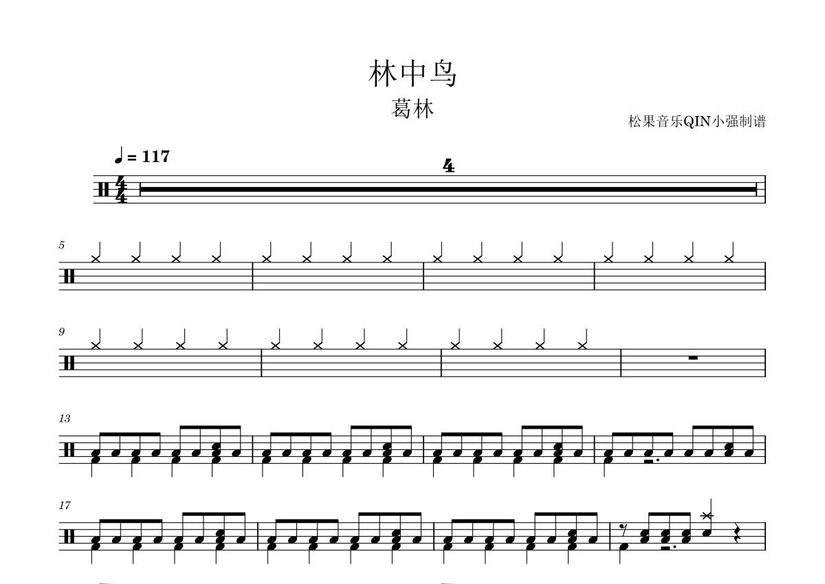 《林中鸟》是葛林演唱的一首歌曲,拍号为4/4拍,这份架子鼓谱共有三张高清图谱,图谱由 @松果音乐QIN小强 编配上传,图谱使用五线谱编配,使用这份林中鸟架子鼓谱,你将能够轻松地敲打出这首葛林的林中鸟,快来尝试吧。《林中鸟》是由高进作词、作曲,葛林演唱的歌曲,发行于2016年9月8日。