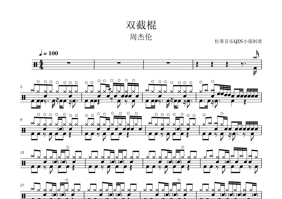 《双截棍》是周杰伦演唱的一首歌曲,这份架子鼓谱共有两张高清图谱,图谱由 @松果音乐QIN小强 编配上传,图谱使用五线谱编配,使用这份双截棍架子鼓谱,你将能够轻松地敲打出这首周杰伦的双截棍,快来尝试吧。《双截棍》是周杰伦演唱的说唱歌曲,由方文山作词,周杰伦作曲,钟兴民编曲,收录于周杰伦2001年9月14日发行的专辑《范特西》中。