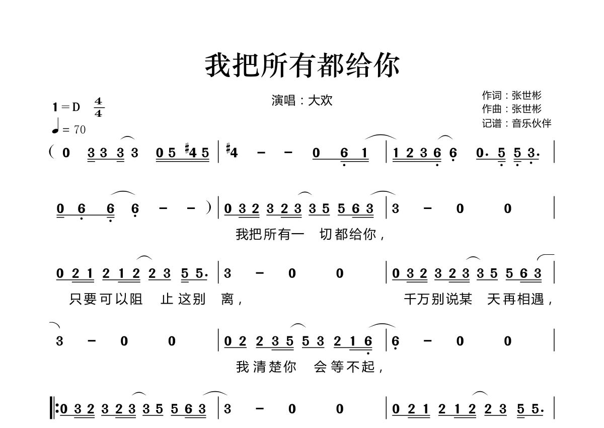 《我把所有都给你》是大欢演唱的一首歌曲,拍号为4/4拍,歌曲速度为每分钟70拍,这份简谱共有两张高清图谱,图谱由 @音乐伙伴 编配上传。