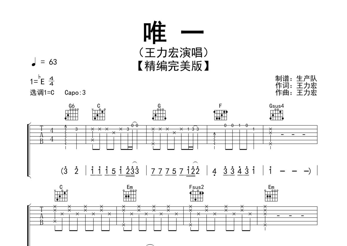 《唯一》是王力宏演唱的一首歌曲,精编完美版,拍号为4/4拍,歌曲速度为每分钟63拍,歌曲原调为Eb调,但由于原调指法比较难,为了方便弹奏,本吉他谱采用的是C调指法编配,变调夹3品弹奏即为原调,当然也可以根据自己的音域改变变调夹位置,或者通过改变和弦调性,以方便自己弹奏,这份吉他谱共有三张高清图谱,图谱由 @生产队 编配上传,图谱使用六线谱编配,包含吉他和弦指法、简谱以及歌词部分,使用这份唯一吉他谱,可以让你更加方便地掌握这首歌曲的弹唱技巧,快来尝试吧。王力宏作词、作曲并演唱的歌曲《唯一》原版吉他谱,完整的前奏、间奏solo编配,精编完美版,怀旧经典!。