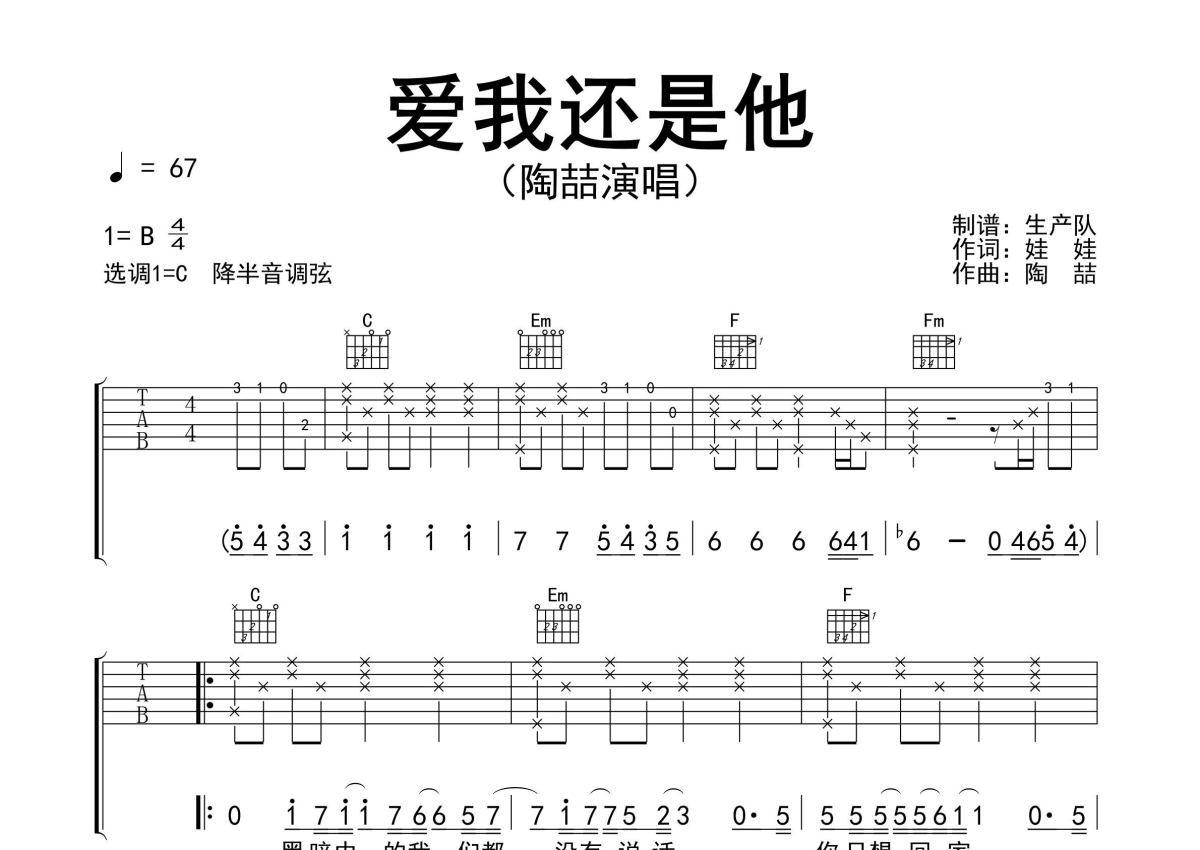 《爱我还是他》是陶喆演唱的一首歌曲,精编完美版,拍号为4/4拍,歌曲速度为每分钟67拍,歌曲原调为B调,但由于原调指法比较难,为了方便弹奏,本吉他谱采用的是C调指法编配,降半音调弦弹奏即为原调,当然也可以根据自己的音域决定是否调弦,这份吉他谱共有四张高清图谱,图谱由 @生产队 编配上传,图谱使用六线谱编配,包含吉他和弦指法、简谱以及歌词部分,使用这份爱我还是他吉他谱,可以让你更加方便地掌握这首歌曲的弹唱技巧,快来尝试吧。陶喆演唱的经典歌曲《爱我还是他》原版吉他谱,完整的前奏、间奏编配,精编完美版,怀旧经典!。
