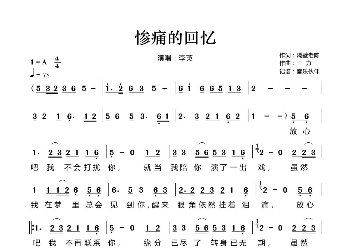 《惨痛的回忆》是李英演唱的一首歌曲,拍号为4/4拍,歌曲速度为每分钟78拍,这份简谱共有两张高清图谱,图谱由 @音乐伙伴 编配上传。
