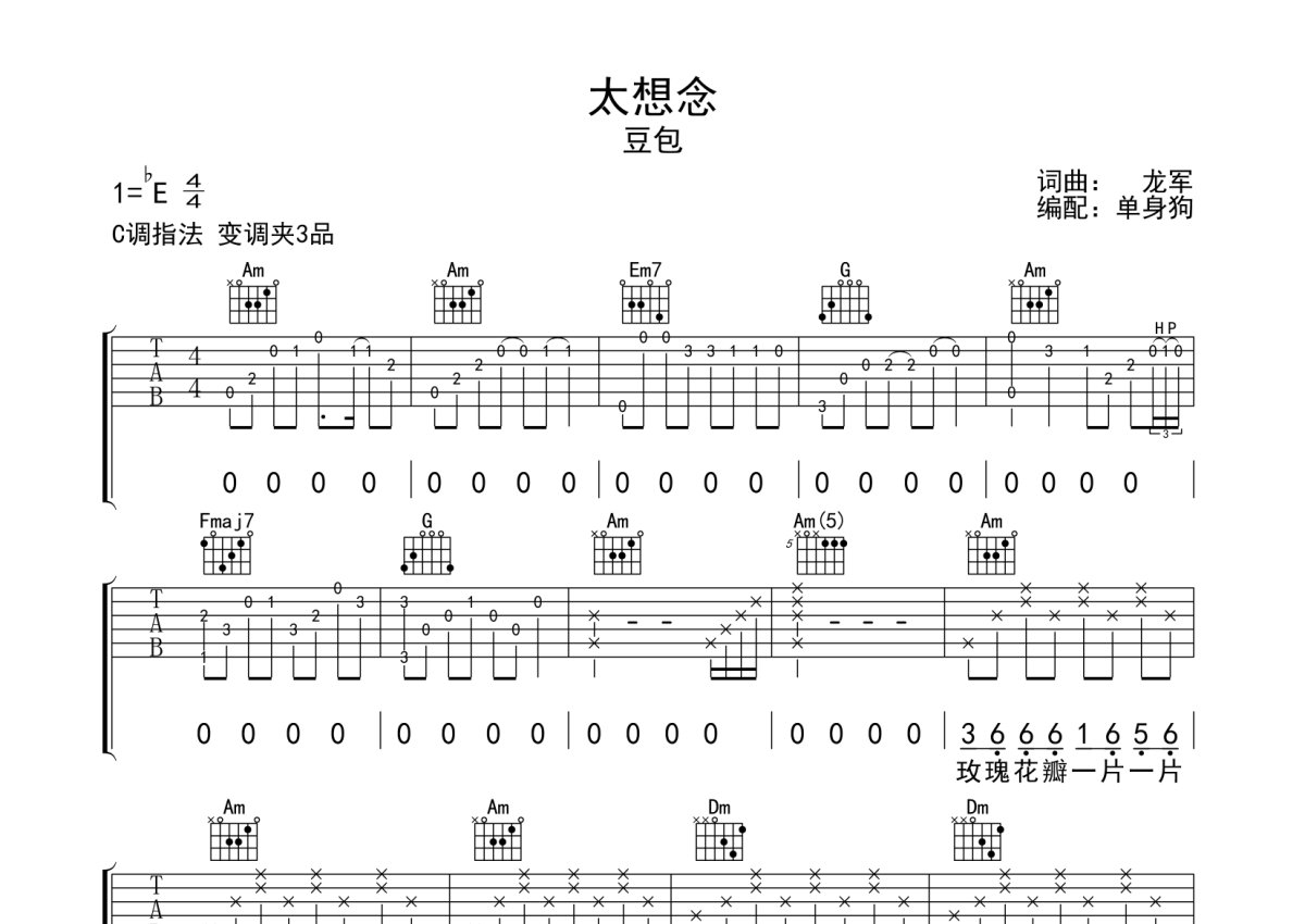 豆包《太想念》吉他谱 - C调弹唱六线谱
