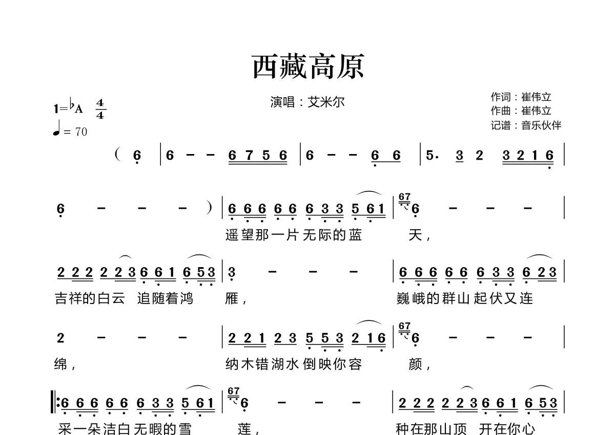 《西藏高原》是艾米尔演唱的一首歌曲,拍号为4/4拍,歌曲速度为每分钟70拍,这份简谱共有两张高清图谱,图谱由 @音乐伙伴 编配上传。