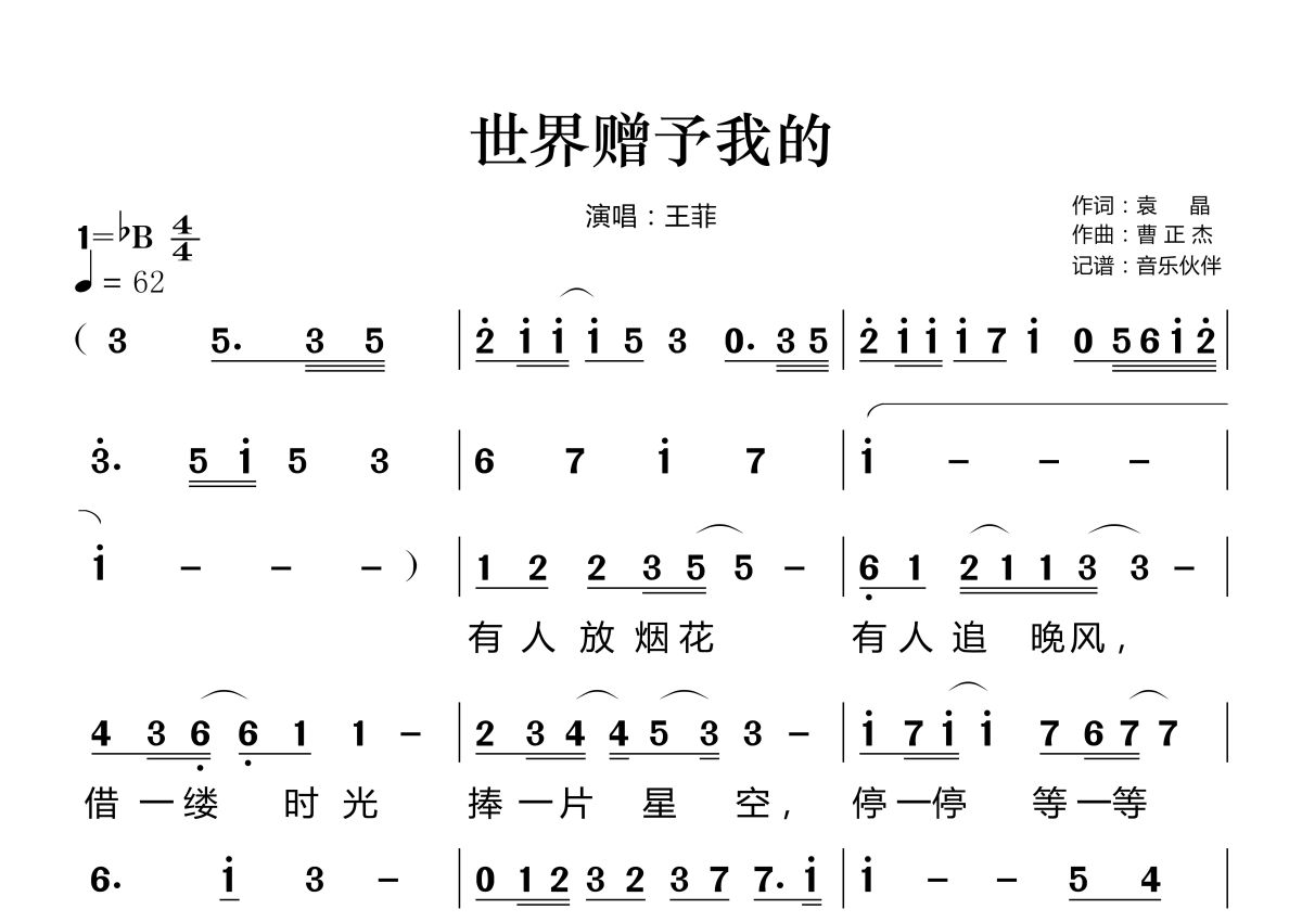 《世界赠予我的》是王菲演唱的一首歌曲,这份简谱共有两张高清图谱,图谱由 @音乐伙伴 编配上传。